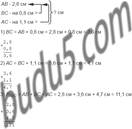 Найдите периметр треугольника АВС, если АВ = 2,8 см, ВС больше АВ на 0,8 см, но меньше АС на 1,1 см.