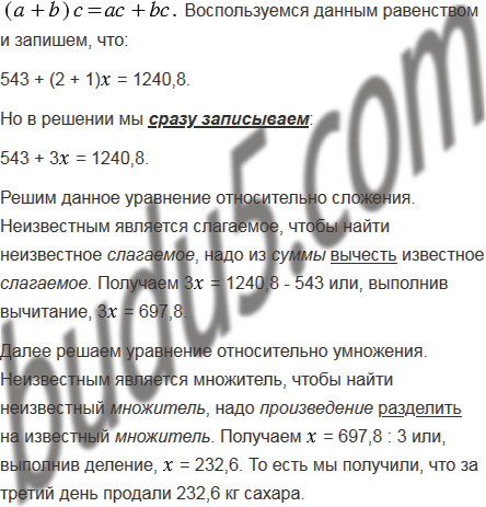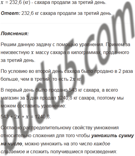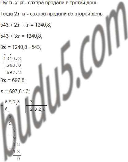 Магазин за 3 дня продал 1240,8 кг сахара. В первый день было продано 543 кг, во второй - в 2 раза больше, чем в третий. Сколько килограммов сахара продано в третий день?