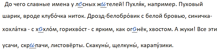 До чего славные имена у л_сных ж_́телей! Пухля́к, например. Пуховый шарик, вроде клубо́чка ниток. Дрозд-белобро́вик с белой бровью, синичка-хохла́тка - с х_хло́м, горихво́ст - с ярким, как ог_нёк, хвостом. А жуки! Все эти усачи, скр_пачи, листовёрты. Скакуны́, щелкуны́, карапу́зики.