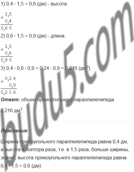 Высота прямоугольного параллелепипеда больше его ширины в полтора раза и меньше длины тоже в полтора раза. Найдите объем прямоугольного параллелепипеда, если его ширина 0,4 дм.