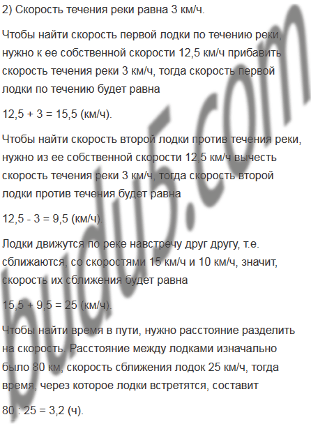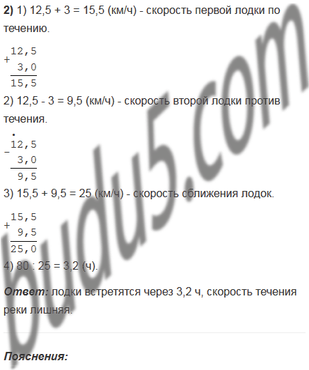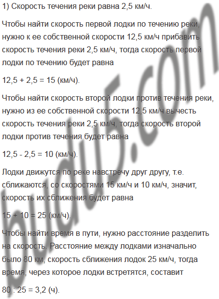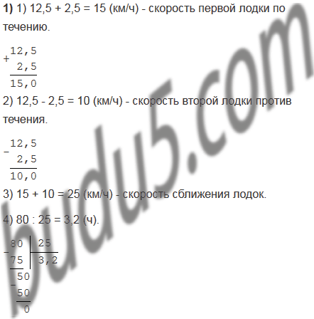 Две лодки, собственная скорость каждой из которых 12,5 км/ч, движутся по реке навстречу одна другой. Через сколько часов они встретятся, если сейчас расстояние между ними 80 км, а скорость течения 2,5 км/ч?