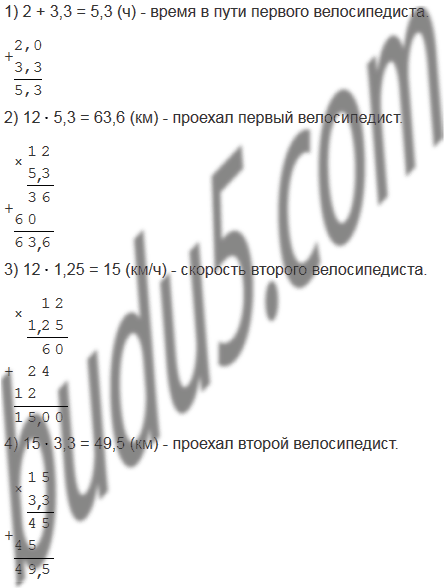 Велосипедист выехал из села со скоростью 12 км/ч. Через 2 ч в противоположном направлении из того же села выехал другой велосипедист, причем скорость второго в 1,25 раза больше скорости первого. Какое расстояние будет между ними через 3,3 ч после выезда второго велосипедиста?