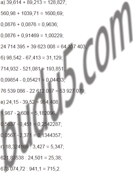 а) 39,614 + 89,213; 560,98 + 1039,71; 0,0876 + 0,0876; 0,0876 + 0,91469; 24 714 395 + 39 623 008;
