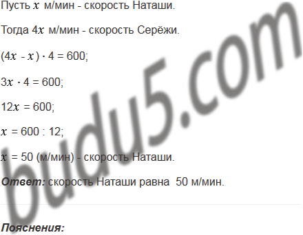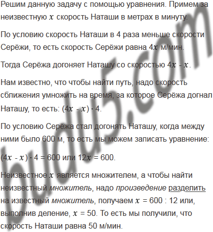 Серёжа стал на велосипеде догонять Наташу, идущую пешком, когда между ними было 600 м, и догнал её через 4 мин. Найдите скорость, с которой шла Наташа, если её скорость в 4 раза меньше скорости Серёжи.