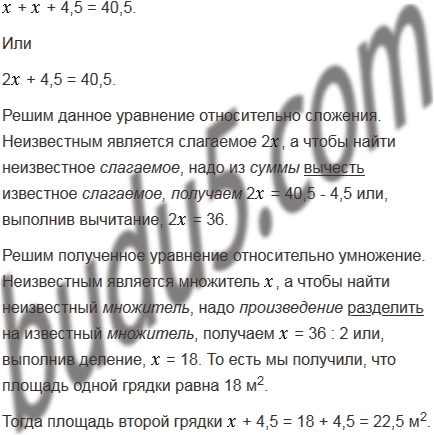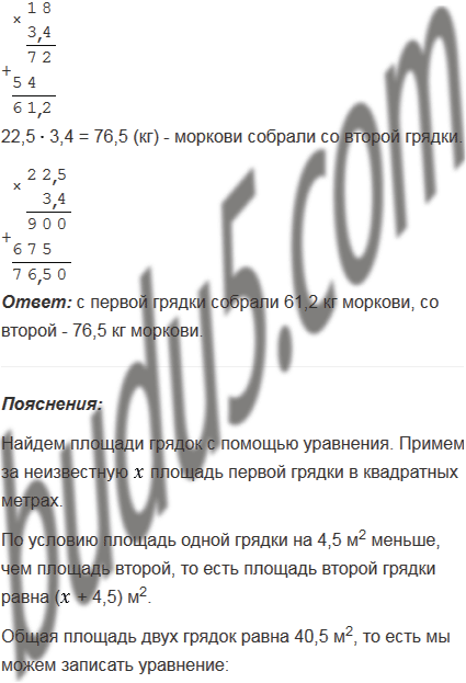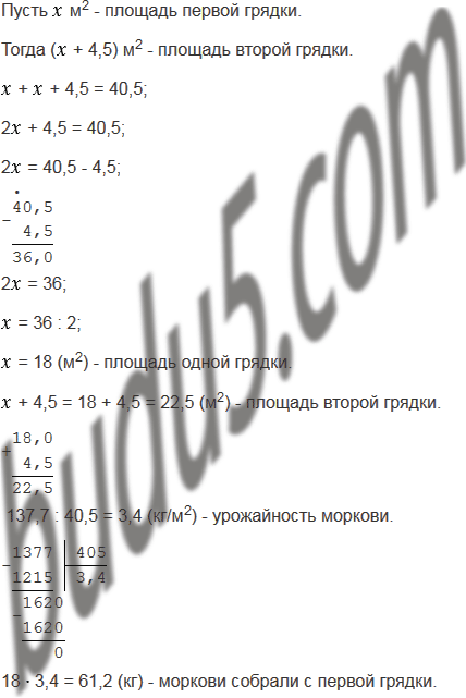 С двух грядок, общая площадь которых 40,5 м2, получили 137,7 кг моркови. Сколько килограммов моркови собрали с каждой грядки, если площадь одной из них на 4,5 м2 меньше, чем площадь другой, а урожайность одинакова?