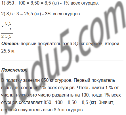 В палатку завезли 850 кг огурцов. Первый покупатель взял для соления 1% всех огурцов, а второй - 3% всех огурцов. Сколько килограммов огурцов купил каждый из них?