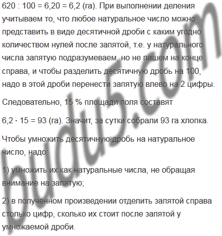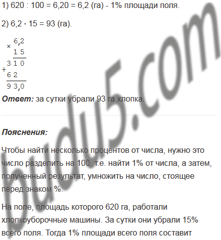 На поле, площадь которого 620 га, работали хлопкоуборочные машины. За сутки они убрали 15% всего поля. Сколько гектаров хлопка убрали за сутки?