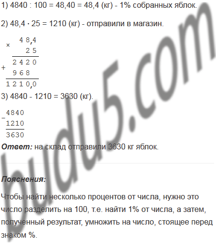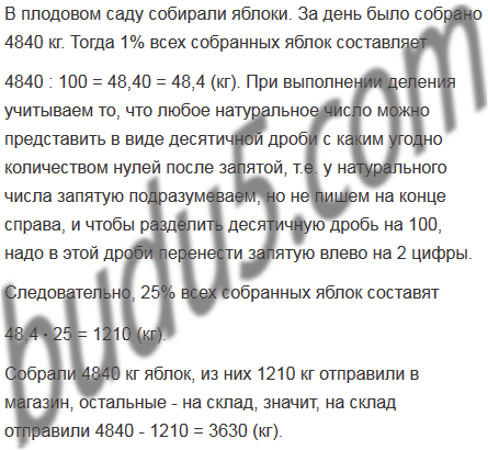 В плодовом саду собирали яблоки. За день было собрано 4840 кг. 25% собранных яблок отправили в магазин, а остальные - на склад. Сколько килограммов яблок отправили на склад?