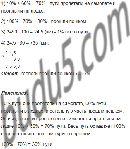 Геологи проделали путь длиной 2450 км. 10% пути они пролетели на самолете, 60% пути проплыли в лодках, а остальную часть прошли пешком. Сколько километров геологи прошли пешком?