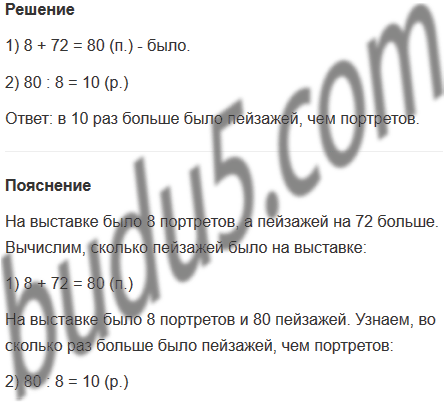 1. На выставке работ учеников художественной студии было 8 портретов, а пейзажей на 72 больше. Во сколько раз больше было пейзажей, чем портретов?