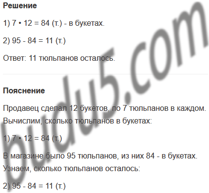 2. В цветочном магазине было 95 тюльпанов. Продавец сделал из них 12 букетов, по 7 тюльпанов в каждом букете. Сколько тюльпанов осталось?