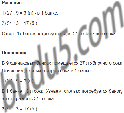 3. В 9 одинаковых банках помещается 27 л яблочного сока. Сколько потребуется таких банок, чтобы разлить 51 л яблочного сока?