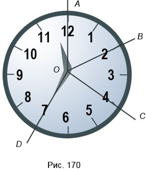 Минутная стрелка за 10 мин повернулась на угол АОВ, за следующие 10 мин - на угол ВОС, а ещё за 15 мин - на угол COD. Сравните углы АОВ и ВОС, ВОС и COD, АОС и АОВ, АОС и COD (рис. 170).