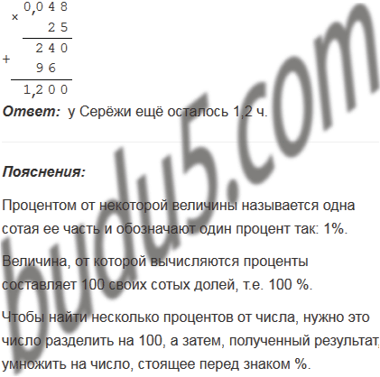 2) У Серёжи было 4,8 ч свободного времени. 35% этого времени он потратил на чтение книги, а 40% на просмотр передач по телевизору. Сколько времени у него ещё осталось?