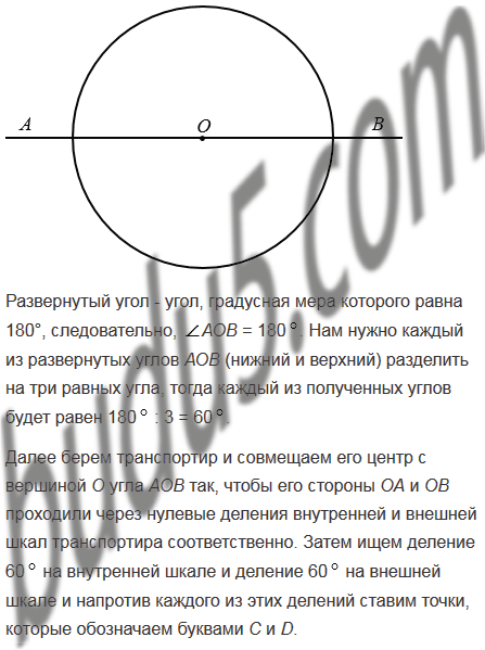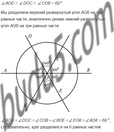 Начертите круг радиусом 3 см. Обозначьте его центр буквой О. Проведите через точку О прямую АВ. С помощью транспортира разделите развернутые углы АОВ с обеих сторон прямой на 3 равных угла. На сколько равных частей разделился круг?