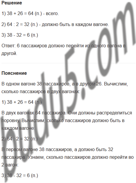 3. В одном вагоне 38 пассажиров, а в другом 26. Сколько пассажиров должны перейти из одного вагона в другой, чтобы в двух этих вагонах их стало поровну?