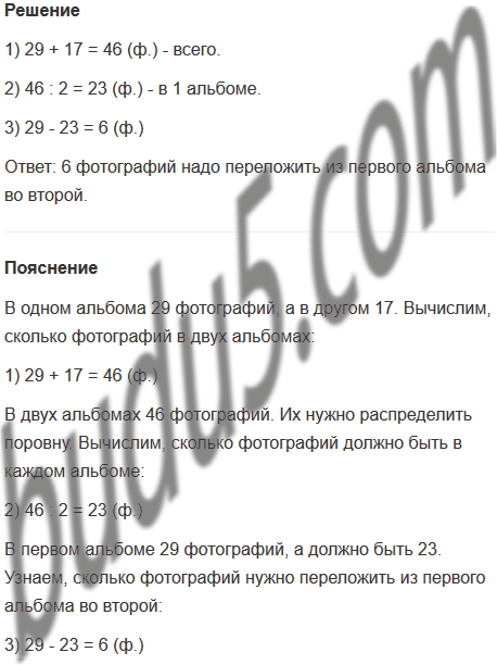 В одном альбоме 29 фотографий, а в другом 17. Сколько фотографий надо переложить из одного альбома в другой, чтобы в двух этих альбомах фотографий стало поровну?