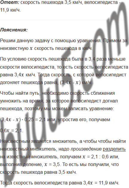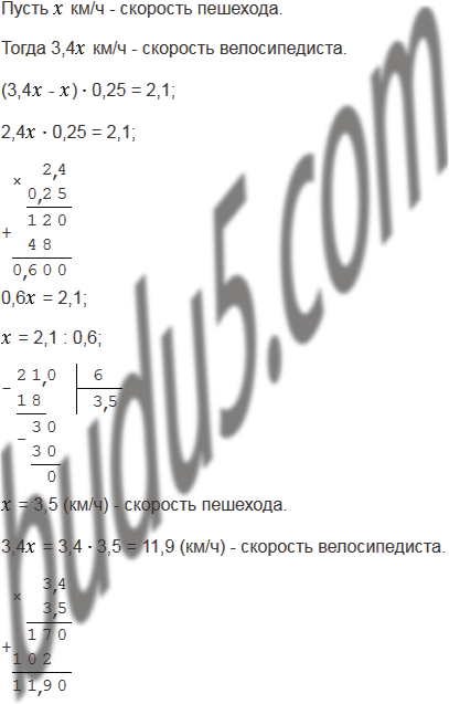 Велосипедист стал догонять пешехода, когда между ними было 2,1 км, и догнал его через 0,25 ч. Найдите скорость велосипедиста и скорость пешехода, если скорость пешехода была в 3,4 раза меньше скорости велосипедиста.
