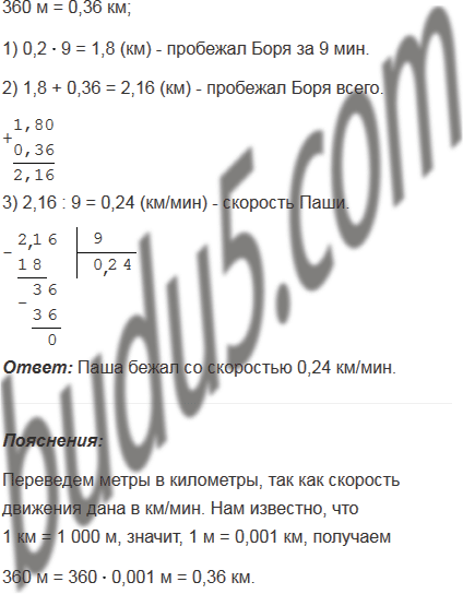 Паша пустился догонять Борю, когда тот отбежал от него на 360 м, и догнал через 9 мин. С какой скоростью бежал Паша, если скорость Бори была 0,2 км/мин?