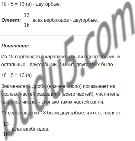 Из 18 верблюдов в караване 5 были одногорбыми, а остальные - двугорбыми. Какую часть всех верблюдов каравана составляли двугорбые верблюды?