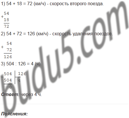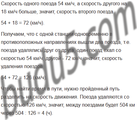 С одной станции одновременно в противоположных направлениях вышли два поезда. Скорость одного из них 54 км/ч, а скорость другого на 18 км/ч больше. Через сколько часов расстояние между ними будет равно 504 км?