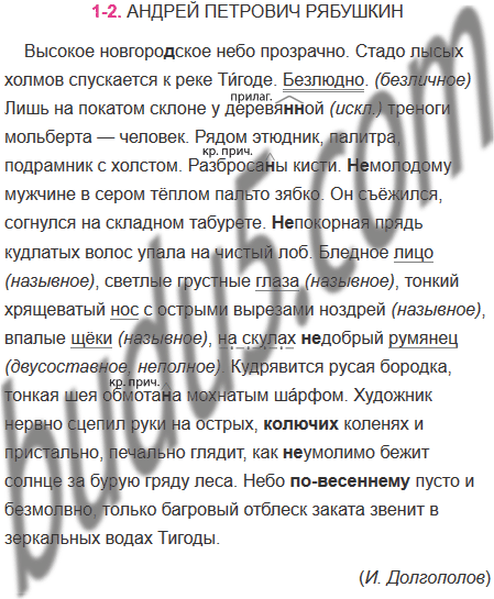 Высокое новгоро..ское небо прозрачно. Стадо лысых холмов спускается к реке Ти́годе. Безлюдно. Лишь на покатом склоне у деревя..ой треноги мольберта — человек. Рядом этюдник, палитра, подрамник с холстом. Разброса..ы кисти. (Не)молодому мужчине в сером тёплом пальто зябко. Он съёжился, согнулся на складном табурете. (Не)покорная прядь кудлатых волос упала на чистый лоб. Бледное лицо, светлые грустные глаза, тонкий хрящеватый нос с острыми вырезами ноздрей, впалые щёки, на скулах (не)добрый румянец. Кудрявится русая бородка, тонкая шея обмота..а мохнатым ша́рфом. Художник нервно сцепил руки на острых, колючих коленях и пристально, печально глядит, как (не)умолимо бежит солнце за бурую гряду леса. Небо по-весеннему пусто и безмолвно, только багровый отблеск заката звенит в зеркальных водах Тигоды.