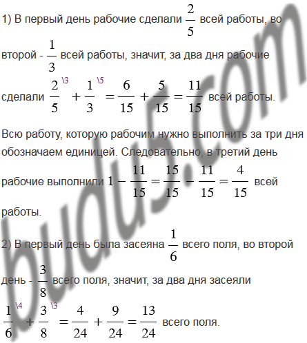 2) Поле было засеяно за три дня. В первый день была засеяна всего поля, во второй день - всего поля. Какая часть всего поля была засеяна в третий день?