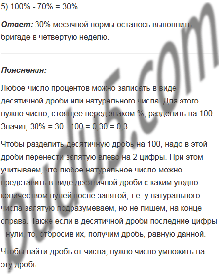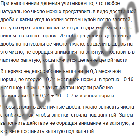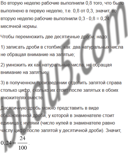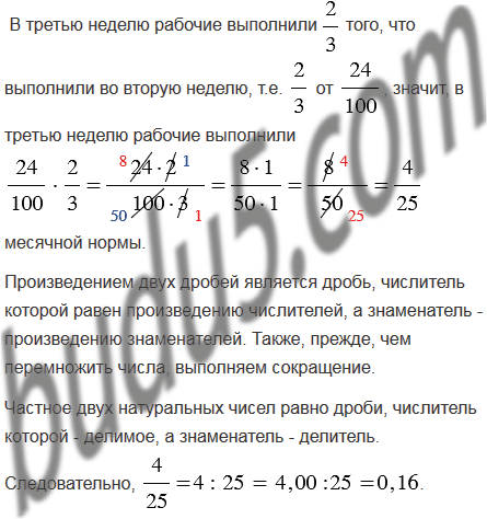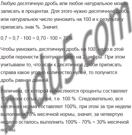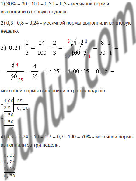 В первую неделю бригадой было выполнено 30% месячной нормы, во вторую неделю - 0,8 того, что было выполнено в первую неделю, а в третью неделю - того, что выполнили во вторую неделю. Сколько процентов месячной нормы осталось выполнить бригаде в четвертую неделю?