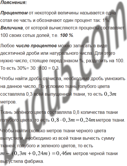 Фабрика выпустила м ткани трёх цветов: голубого, зелёного и чёрного. Ткань голубого цвета составляла 30% всей выпущенной ткани. Ткань зелёного цвета составляла 0,8 количества ткани голубого цвета. Сколько метров ткани чёрного цвета выпустила фабрика? Найдите значение получившегося выражения при = 5520; 22 000.