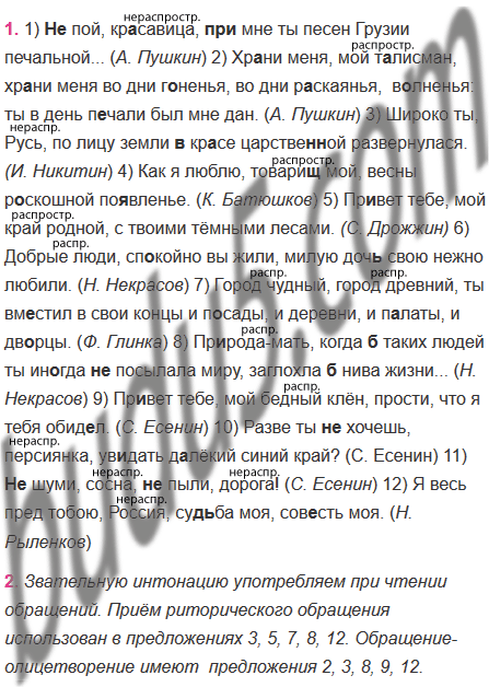 1) (Не)пой кр..савица (при)мне ты песен Грузии печальной... (А. Пушкин) 2) Хр..ни меня мой т..лисман хр..ни меня во дни г..ненья во дни р..скаянья в..лненья: ты в день п..чали был мне дан. (А. Пушкин) 3) Широко ты Русь по лицу земли (в)кр..се царстве..ой развернулася. (И. Никитин) 4) Как я люблю товарищ(?) мой весны р..скошной по..вленье. (К. Батюшков) 5)Пр..вет тебе мой край родной с твоими тёмными лесами. (С. Дрожжин) 6) Добрые люди сп..койно вы жили милую доч(?) свою нежно любили. (Н. Некрасов) 7) Город чудный город древний ты вм..стил в свои концы и п.хады и деревни и п..латы и дв..рцы. (Ф. Глинка) 8) Пр..рода-мать когда(б) таких людей ты ин..гда (не)посылала миру, заглохла(б) нива жизни... (Н. Некрасов) 9) Пр..вет тебе мой бедный клён прости что я тебя обид..л. (С. Есенин) 10) Разве ты (не)хочешь персиянка ув..дать д..лёкий синий край? (С. Есенин) 11) (Не)шуми сосна (не)пыли дорога! (С. Есенин) 12) Я весь пред тобою Россия су..ба моя сов.сть моя. (Н. Рыленков)