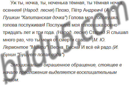 Из художественных текстов хрестоматии по литературе выпишите примеры предложений с обращениями, выделенными восклицательным знаком. Объясните постановку этого знака, выразительно прочитайте предложения.