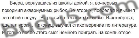 Вчера, вернувшись из школы домой, я, во-первых, ... Во-вторых, ... . В-третьих, ... . В-четвёртых, ... . Наконец .... И только после этого ....