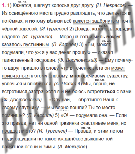 1) Кажется шепч..т колосья друг другу. (Н. Некрасов) — Из осв..щённого места трудно разглядеть, что делается (в)потёмках, и (по)тому (в)близи всё кажется задёрнутым почти ч..рной завесой. (И.Тургенев) 2) Дождь казалось зар..дил надолго. (И. Тургенев) — Море на сотни миль (во)круг казалось пусты..ым. (В. Катаев) 3) «Вы может подумали, что уж я у вас денег прошу!» — сказал таинственный г..сподин. (Ф. Достоевский) — Ему почему-то вдруг пр..шло в голову, что (в)течени.. лета он может пр..вязаться к этому слабому, (много)речивому существу, увлечься и влюбиться. (А. Чехов) 4) Мы верно (не)встретимся завтра, хотя я и (не)боюсь встрети(тся, ться) с вами. (Ф. Достоевский) — «Слушай, — обратился Ваня к своему спутн..ку, — мы верно пошли? Ты то место помн..шь? (Л. Кассиль) 5) «О! — подумала она. — Если это правда, нет ни одной тр..винки счастливее меня, но правда ли это? (И. Тургенев) — Правда и этим летом люди ощущали не такое уж д..лёкое дыхание той пам..тной осени и зимы. (А. Межиров)