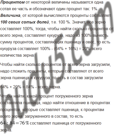 На складе были пшеница, овёс и кукуруза, причём пшеница составляла 64%, овёс - 16% всего количества зерна. В товарный состав загрузили всю пшеницу и всю кукурузу. Какой процент погруженного зерна составляла пшеница? Какой процент погруженного зерна составляла бы пшеница, если бы вместо кукурузы погрузили овёс?