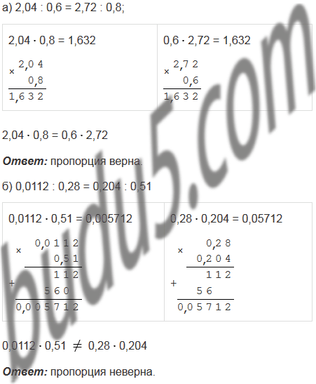 а) 2,04 : 0,6 = 2,72 : 0,8;