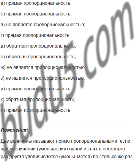 Определите, является ли прямо пропорциональной, обратно пропорциональной или не является пропорциональной зависимость между величинами: а) путем, пройденным автомашиной с постоянной скоростью, и временем движения; б) стоимостью товара, купленного по одной цене, и его количеством; в) площадью квадрата и длиной его стороны; г) массой стального бруска и его объемом; д) числом рабочих, выполняющих с одинаковой производительностью труда некоторую работу, и временем выполнения этой работы; е) стоимостью товара и его количеством, купленным на определенную сумму денег; ж) возрастом человека и размером его обуви; з) объемом куба и длиной его ребра; и) периметром квадрата и длиной его стороны; к) дробью и ее знаменателем, если числитель не изменяется; л) дробью и ее числителем, если знаменатель не изменяется.