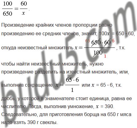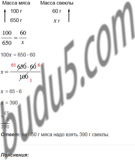 Для приготовления борща на каждые 100 г мяса надо взять 60 г свеклы. Сколько свеклы надо взять на 650 г мяса?