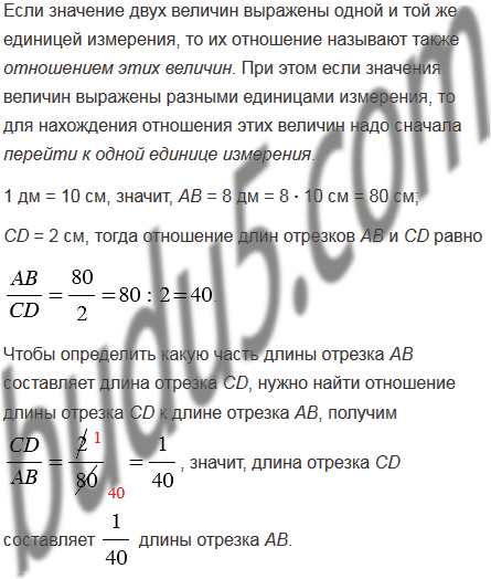 Длина отрезка АВ равна 8 дм, а длина отрезка СD равна 2 см. Найдите отношение длин отрезков АВ и СD. Какую часть длины отрезка АВ составляет длина отрезка СD.