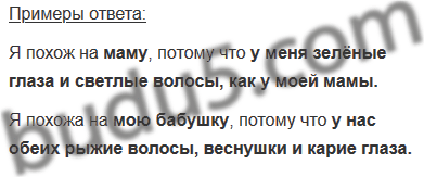 Расскажи, на кого похож (похожа) ты. Используй в ответе слова: «Я похож (похожа) на ..., потому что...».