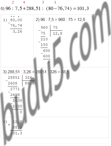 б) 96 : 7,5 + 288,51 : (80 - 76,74).