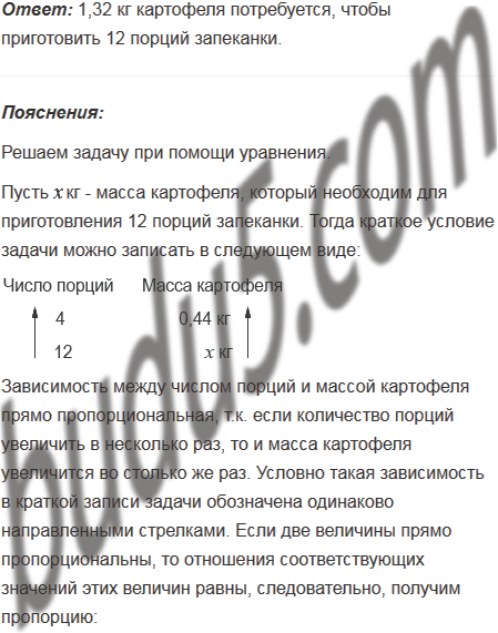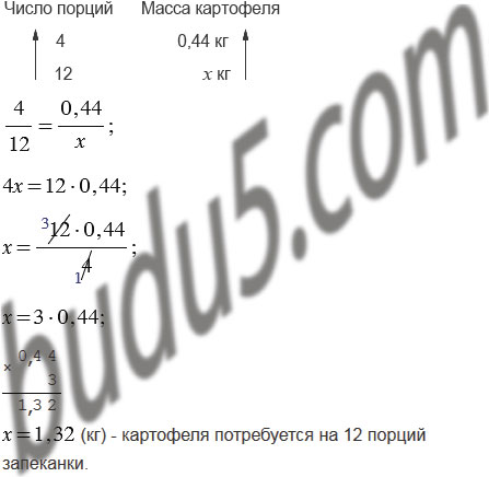 Чтобы приготовить 4 порции картофельной запеканки, нужно взять 0,44 кг картофеля. Сколько картофеля потребуется, чтобы приготовить 12 порций запеканки?