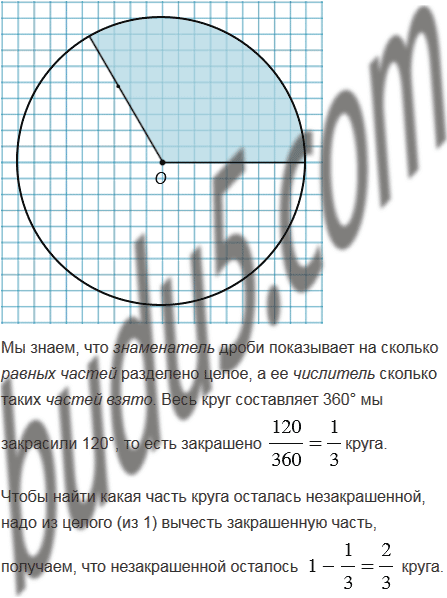 Начертите окружность и постройте два её радиуса, угол между которыми 120°. Закрасьте часть круга между этими радиусами. Какая часть круга окажется закрашенной и какая часть круга останется незакрашенной?