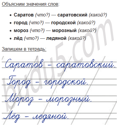 Подумай, какие слова ты будешь использовать, объясняя значение слов саратовский, городской, морозный, ледяной.