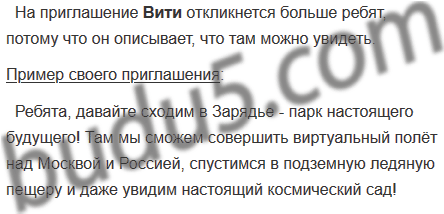 На какое приглашение откликнется больше ребят? Почему? А куда тебе хотелось бы пригласить одноклассников? Составь приглашение так, чтобы ребята заинтересовались экскурсией.