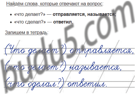 Найди в упражнении 1 два слова, которые отвечают на вопрос «что делает?», и слово, которое отвечает на вопрос «что сделал?». Запиши вопросы и слова в тетрадь.