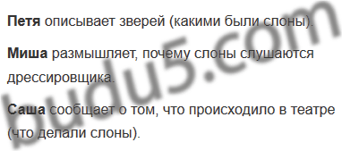 Кто из мальчиков описывает зверей (какими были слоны)? Кто из ребят размышляет (почему слоны слушаются дрессировщика)? Кто сообщает о том, что происходило в театре (что делали слоны)?