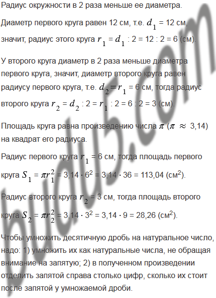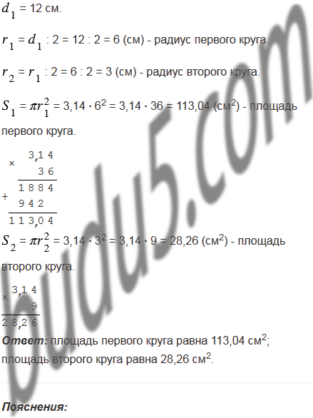 Найдите площадь круга, у которого диаметр равен 12 см. Найдите площадь круга, у которого диаметр в 2 раза меньше диаметра первого круга.