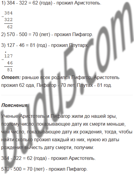 Древнегреческий ученый Аристотель родился в 384 г., а умер в 322 г. Пифагор родился в 570 г. и умер в 500 г. Историк Плутарх родился в 46 г., умер в 127 г. Кто из этих ученых родился раньше? Сколько лет прожил каждый из них?