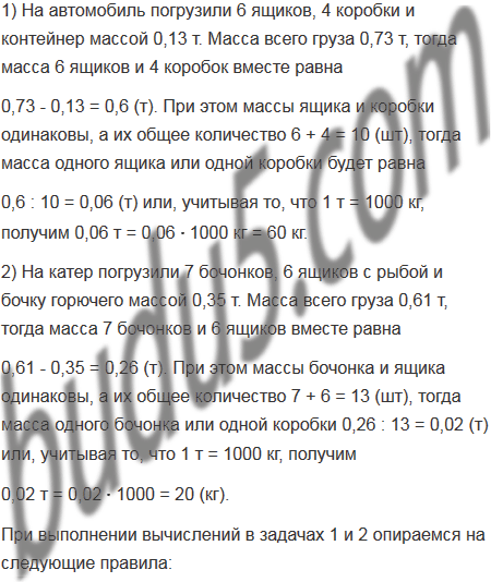 1) На автомобиль погрузили 6 ящиков, 4 коробки и контейнер массой 0,13 т. Масса всего груза 0,73 т, массы ящика и коробки одинаковы. Какова масса одного ящика или одной коробки?