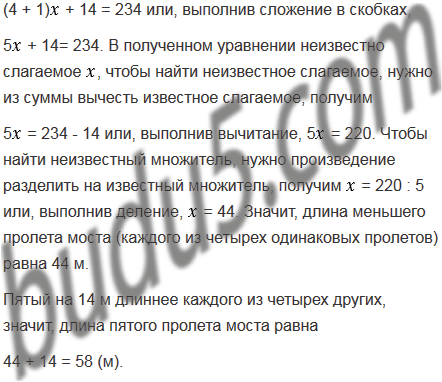 Через реку построен мост длиной 234 м. Он состоит из пяти пролетов, четыре из которых имеют одинаковую длину, а пятый на 14 м длиннее каждого из остальных. Какова длина каждого пролета моста?